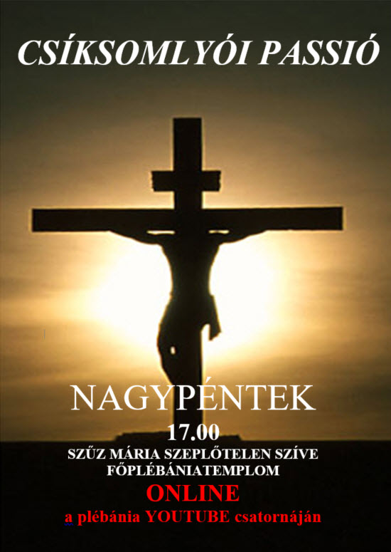 Nagypénteken Csíksomlyói Passió. Amint a plakáton is látható, a Plébánia youtube-csatornáján lehet bekapcsolódni. Link: https://youtu.be/PwV9CJTi17U .
